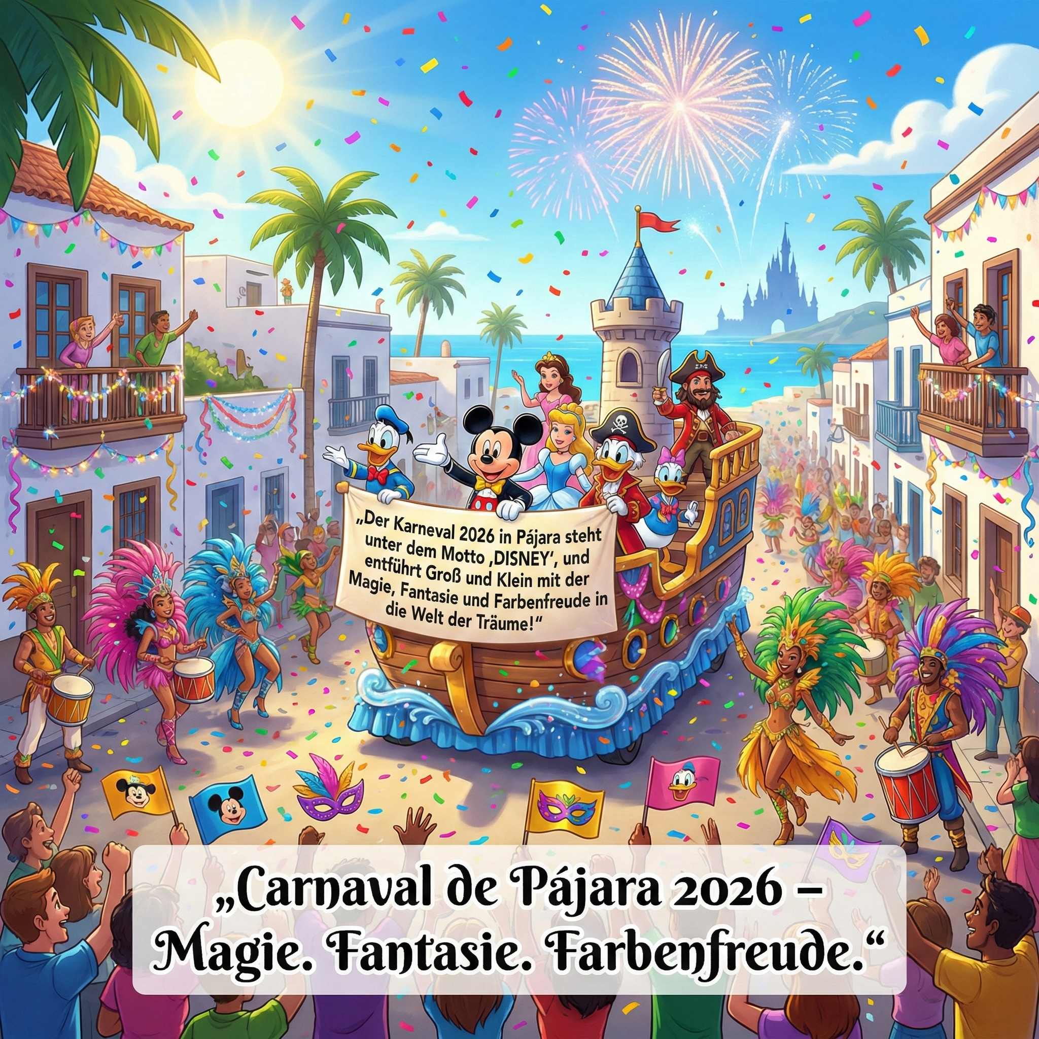 In der Gemeinde Pájara steht der Karneval 2026 unter dem Motto „DISNEY“. Vom 6. bis 22. März verwandeln sich die Orte La Lajita, Pájara, Costa Calma und Morro Jable in eine bunte Welt der Fantasie. Die Veranstaltungen bieten Magie für Groß und Klein – mit Kostümgruppen, Wahl der Königinnen und vielen weiteren Attraktionen. Das Rathaus ruft Bürgerinnen und Bürger zur aktiven Teilnahme auf. Der Gemeinderat Juan José Viera betont die Bedeutung gemeinsamer Feierlichkeiten. Die Termine sind offiziell bestätigt und ermöglichen eine rechtzeitige Planung. Das Disney-Motto sorgt für zauberhafte Momente und kreative Verkleidungen. Gerade Familien finden hier eine bunte und fröhliche Atmosphäre. Die Veranstaltungen bringen die Gemeinschaft zusammen und machen den Karneval in Pájara zu einem einzigartigen Erlebnis.
